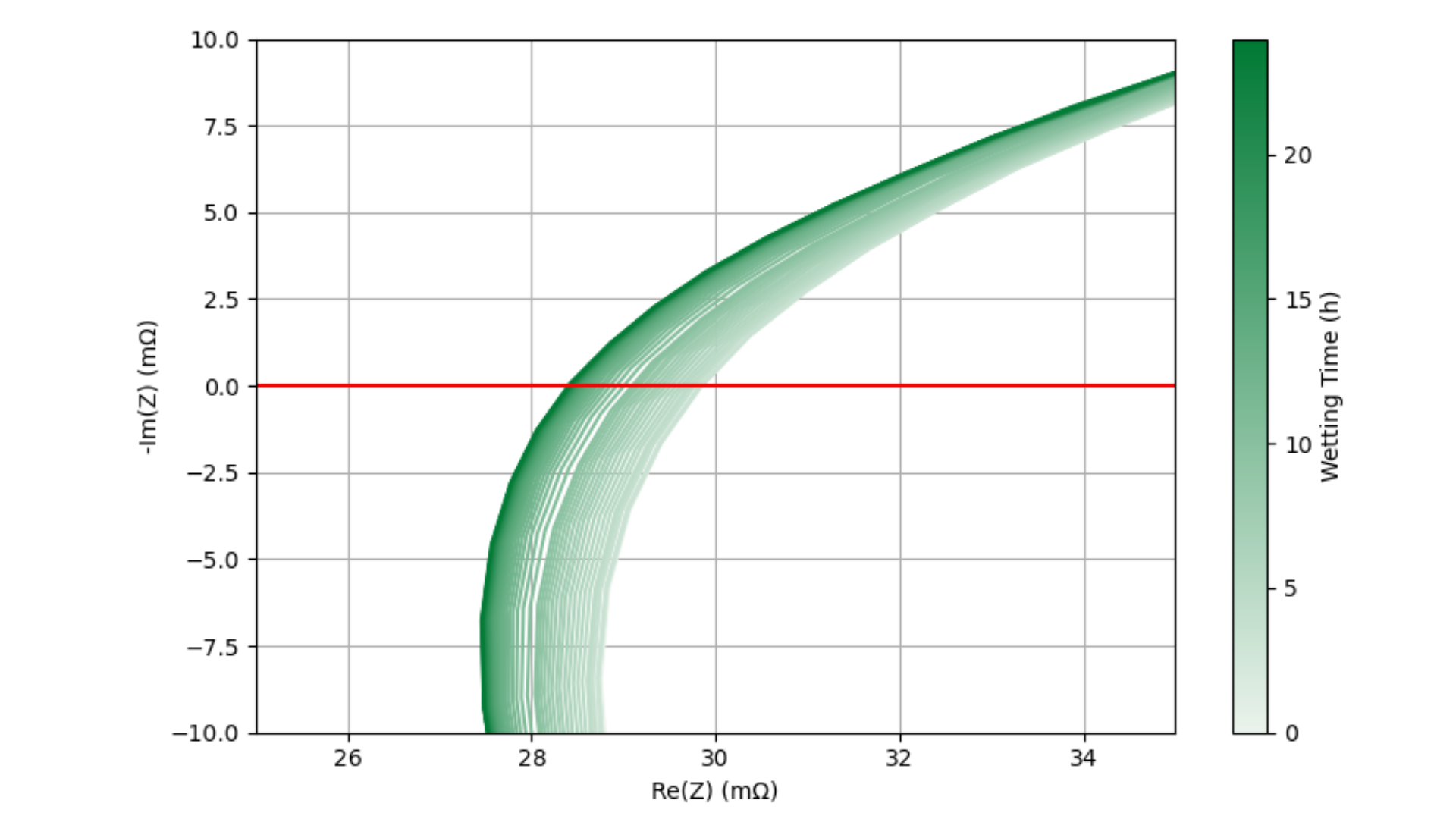 In this study, the high-frequency region (HFR) is defined as the region surrounding the Re(Z)-axis intercept. Figure 2 shows a single Nyquist plot of the EIS spectrum obtained from one of the cells in this study. The HFR area of interest is enclosed in the red rectangle. This area is enlarged in Figure 3 and all ~64 EIS scans for this cell are displayed, increasing in darkness for higher wetting times. As wetting progresses, the Nyquist spectra systematically shift toward lower Re(Z) values. By interpolating and tracking the Re(Z) intercept over time, wetting progression can be quantitatively monitored.