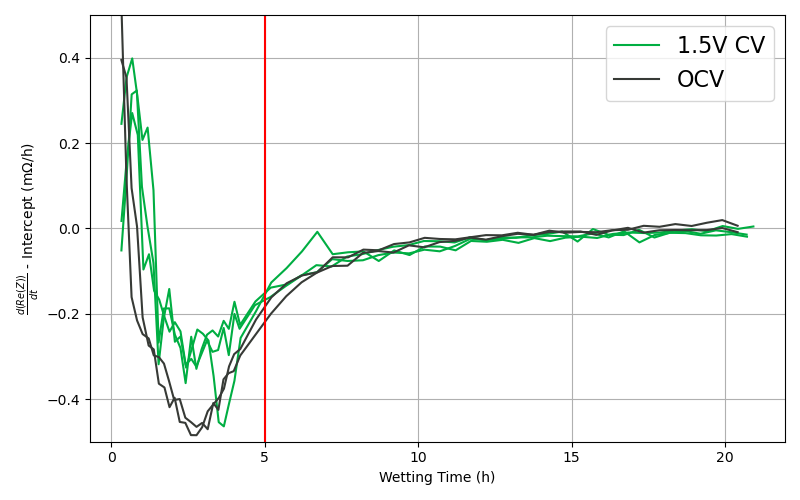 Although the absolute resistance values differ between the 1.5 V and OCV groups (Figure 4), both groups reach their resistance plateaus at the same time. This is confirmed by examining the time derivative of the Re(Z) intercept (Figure 5), which converges for both groups after ~5 hours.
