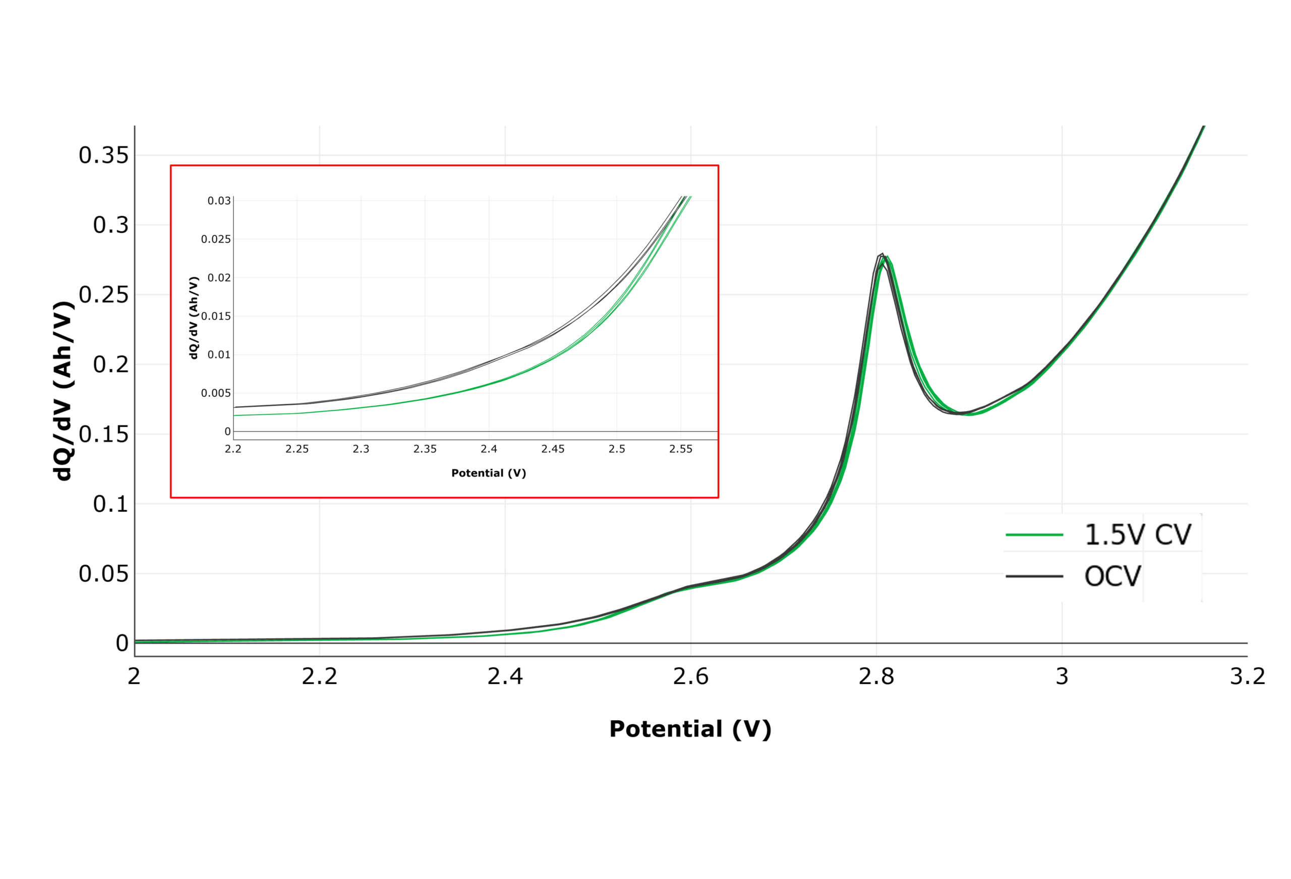 Figure 6 shows dQ/dV during the electrolyte reduction region of the first formation charge. The VC reduction peak at ~2.8 V is clearly resolved, along with subtle differences in the 2.2–2.6 V region (see inset) between wetting conditions. This demonstrates UHPC’s sensitivity to small electrochemical variations.