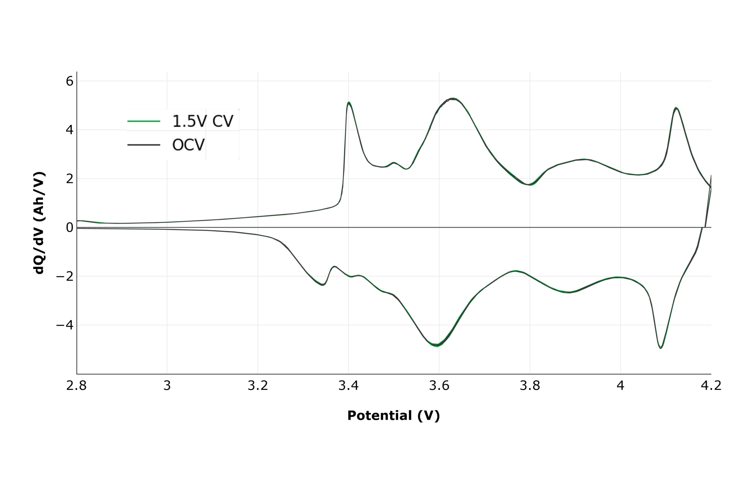 Figure 7 presents the full cycle dQ/dV at C/20 where each peak corresponds to a distinct intercalation or deintercalation process occurring in the graphite anode or NMC cathode. UHPC enables detection of small peak shifts and shape changes, providing a non-destructive, in-situ method for tracking degradation mechanisms.