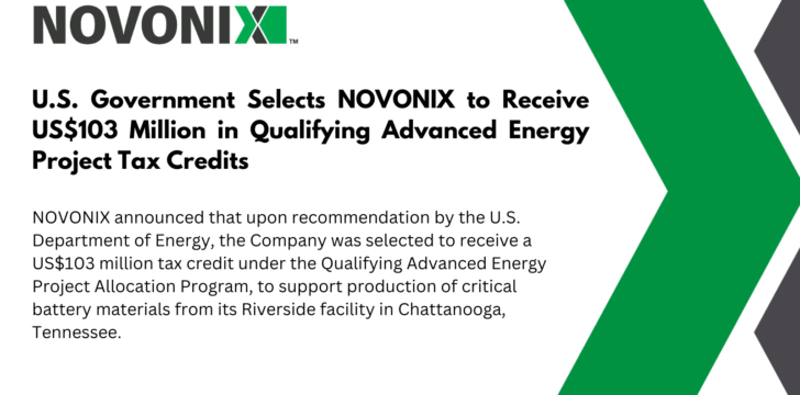 BRISBANE, Australia, April 01, 2024 (GLOBE NEWSWIRE) — NOVONIX Limited (NASDAQ: NVX, ASX: NVX) (“NOVONIX” or the “Company”), a leading battery materials and technology company, today announced that upon recommendation by the U.S. Department of Energy (“DOE”), the Company was selected to receive a US$103 million tax credit (the “48C tax credit”) under the Qualifying Advanced Energy Project Allocation Program (the “48C program”), to support production of critical battery materials from its Riverside facility in Chattanooga, Tennessee.